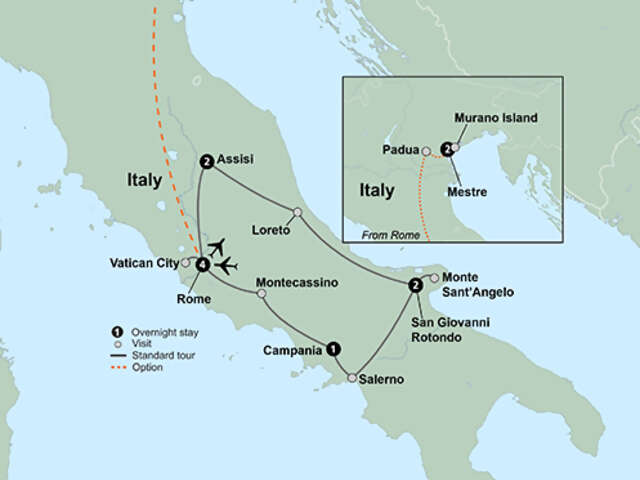 Travel across the Apennine Mountains to the Marian shrine of Loreto. Discover the Holy House of Nazareth and the beautiful Madonna of Loreto where more than 50 popes have made a pilgrimage. Celebrate Mass before continuing your journey to San Giovanni Rotondo, home of Padre Pio.